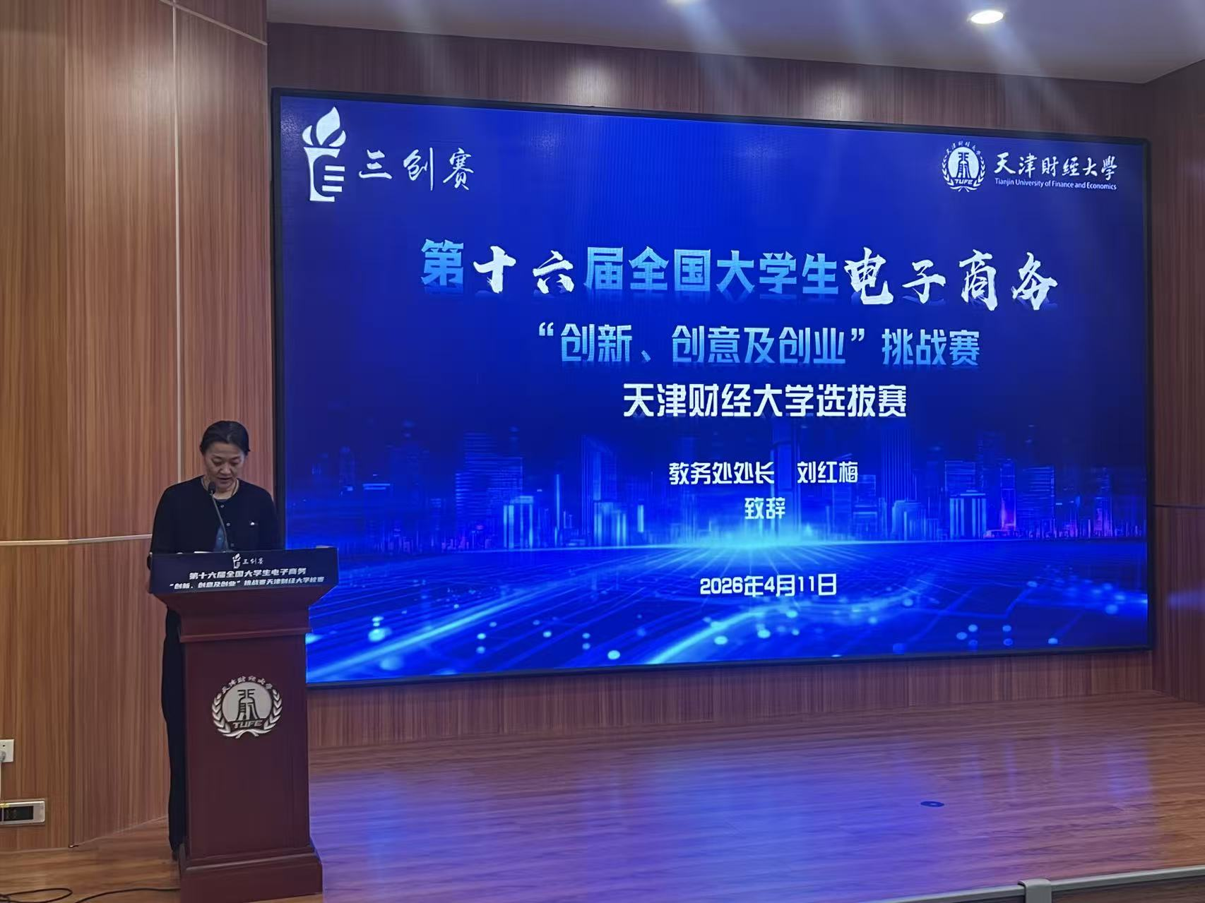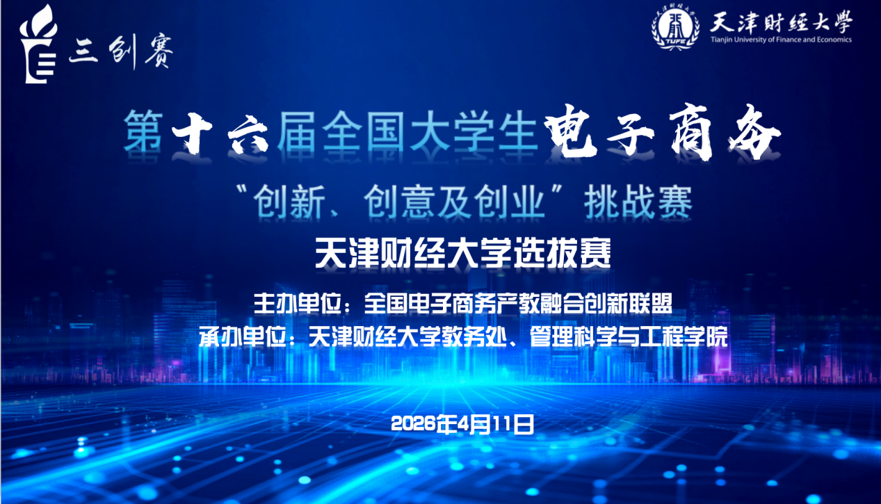近日,由教务处和管理科学与工程学院联合承办的第十六届全国大学生电子商务“创新、创意及创业”挑战赛(以下简称电子商务“三创赛”)天津财经大学校赛成功举办。来自天津大学、天津工业大学、天津商业大学、天津职业技术师范大学、天津农学院、天津中德应用技术大学等高校及企业专家莅临指导并担任评委,校教务处、管理科学与工程学院领导班子成员以及参赛团队参加了开幕式。开幕式由管理科学与工程学院管理信息系统系主任单春玲主持。